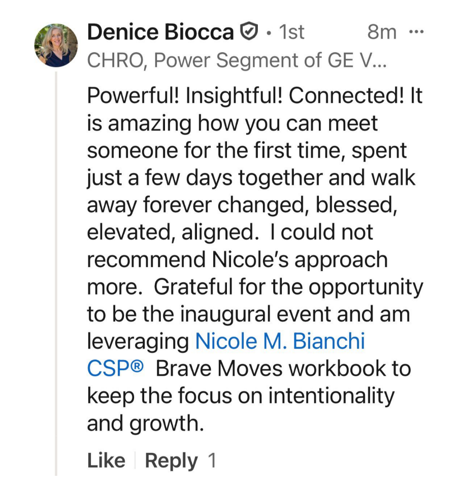 “Nicole and the Brave LeadHERship Retreat cohort led me to appreciate how showing up inauthentically will never lead to happiness or success in business or in life. From that tough but well-supported realization, I've embraced my authentic leadership style and unique abilities. I am already making positive and measurable impact in my business and in my life with the Brave Operating System framework. The accountability forged in deep relationships made at the Retreat are a gift that will last a lifetime.”